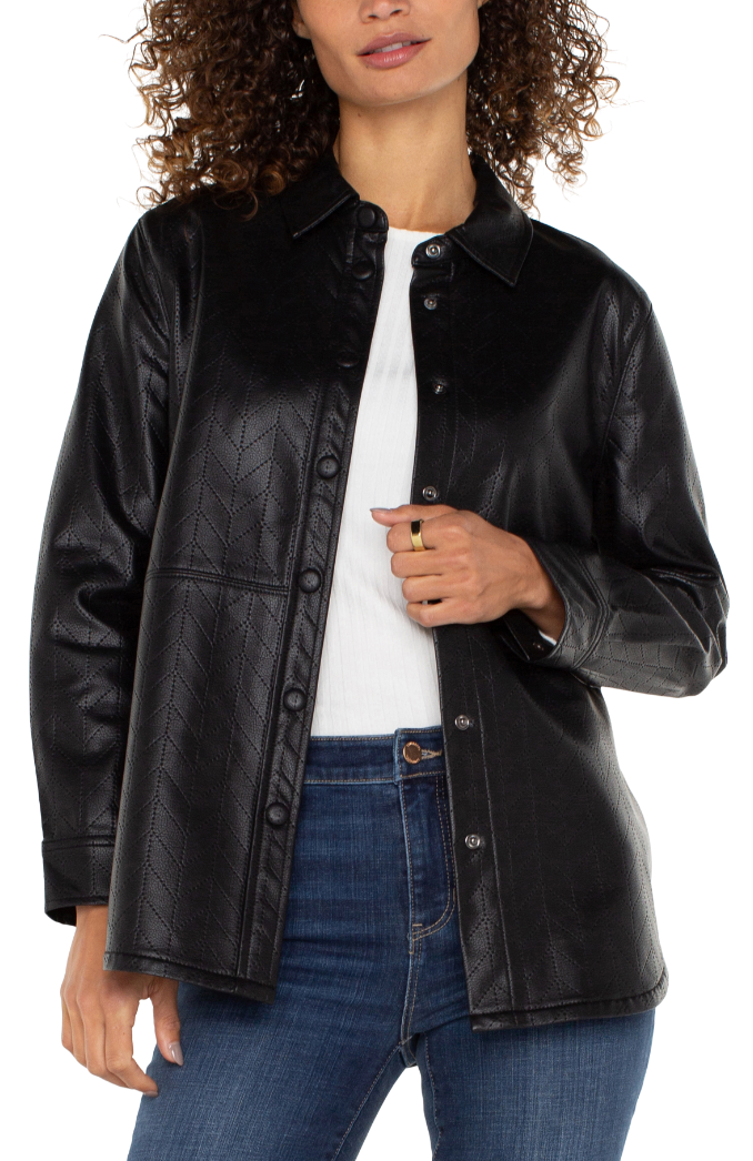 Introducing the Seamed Shacket, a fusion of sophistication and trend-setting style tailored for the modern woman who exudes confidence and flair. This versatile piece combines the structure of a shirt with the warmth of a jacket, offering a seamless transition between seasons. What sets this shacket apart is its luxurious chevron perforated vegan leather fabric, adding a touch of opulence to your ensemble while staying true to ethical fashion. 28-1/2" HPS. Semi fitted. Seaming detail. Front button closure. Buttons at cuff. Collared. Vegan leather. Chevron perforated vegan leather.