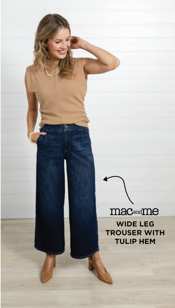 The Mac & Me 27" Skyrise Wide Leg Denim features a distinctive tulip hem that adds a modern twist to classic wide-leg styling. Crafted for a flattering high-rise fit, this denim offers both comfort and a sleek silhouette. Ideal for those seeking a versatile yet fashion-forward piece, it pairs effortlessly with a variety of tops and footwear for elevated everyday wear.