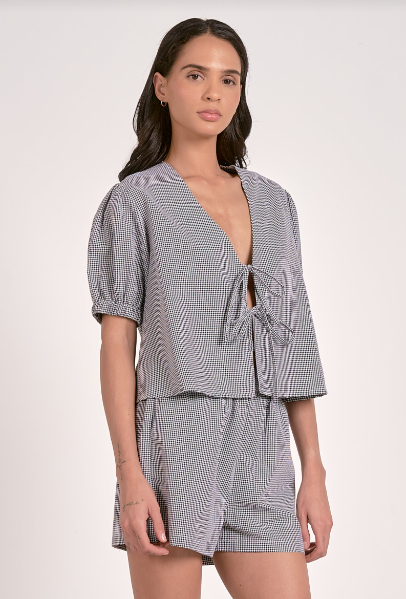 The Eleanor Tie Front Top with Puff Sleeve is a stylish and feminine addition to your wardrobe. The tie front detail adds a touch of elegance, while the puff sleeves add a trendy, statement look. Made with high-quality materials, this top offers both comfort and style for any occasion.
