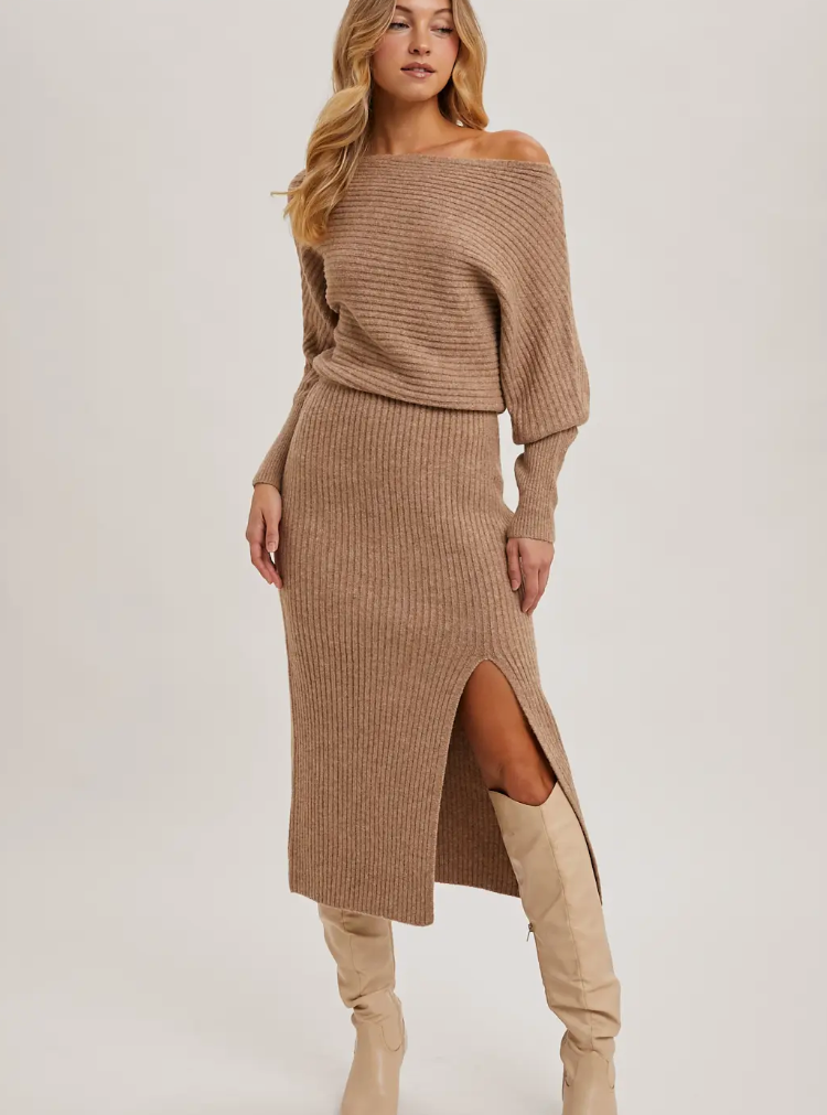 Daphne One Shoulder Off Side Slit Midi Knit Sweater Dress