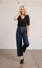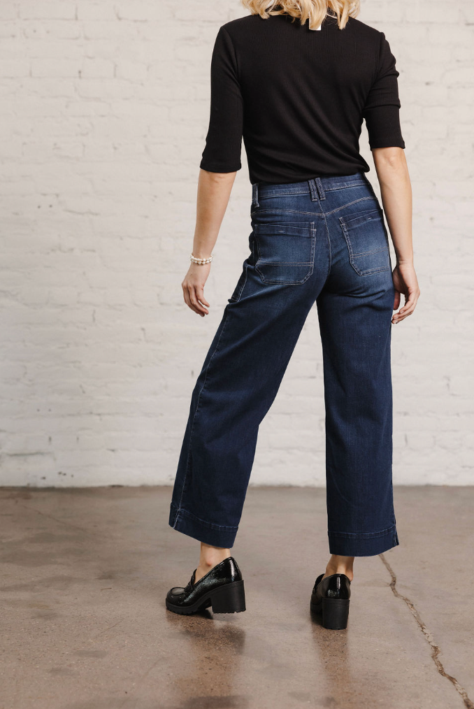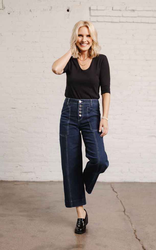 Step up your denim game with the Mac and Me Button Fly Wide Leg jeans. Featuring a chic button fly closure, slant side pockets, and contrast stitching against rich indigo denim, these jeans are guaranteed to be a wardrobe favorite. With a flattering 10” rise, 22” leg opening, and an ankle grazing 27” inseam, these Mac and Me’s are designed to show off your favorite footwear.
