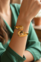 The Zella Cuff Bracelet combines architectural elegance with everyday wearability. Forged from premium steel with a lustrous gold finish, this sculptural piece features a gracefully curved form that molds to your wrist's natural contours. The open-ended design offers adjustable comfort without sacrificing visual impact—a refined accessory that transitions seamlessly from casual to formal occasions.