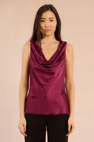 Effortlessly elegant, this satin cowl neck top drapes beautifully for a touch of timeless sophistication. The sleeveless silhouette makes it perfect for layering under blazers or dressing up with statement jewelry for an evening out.