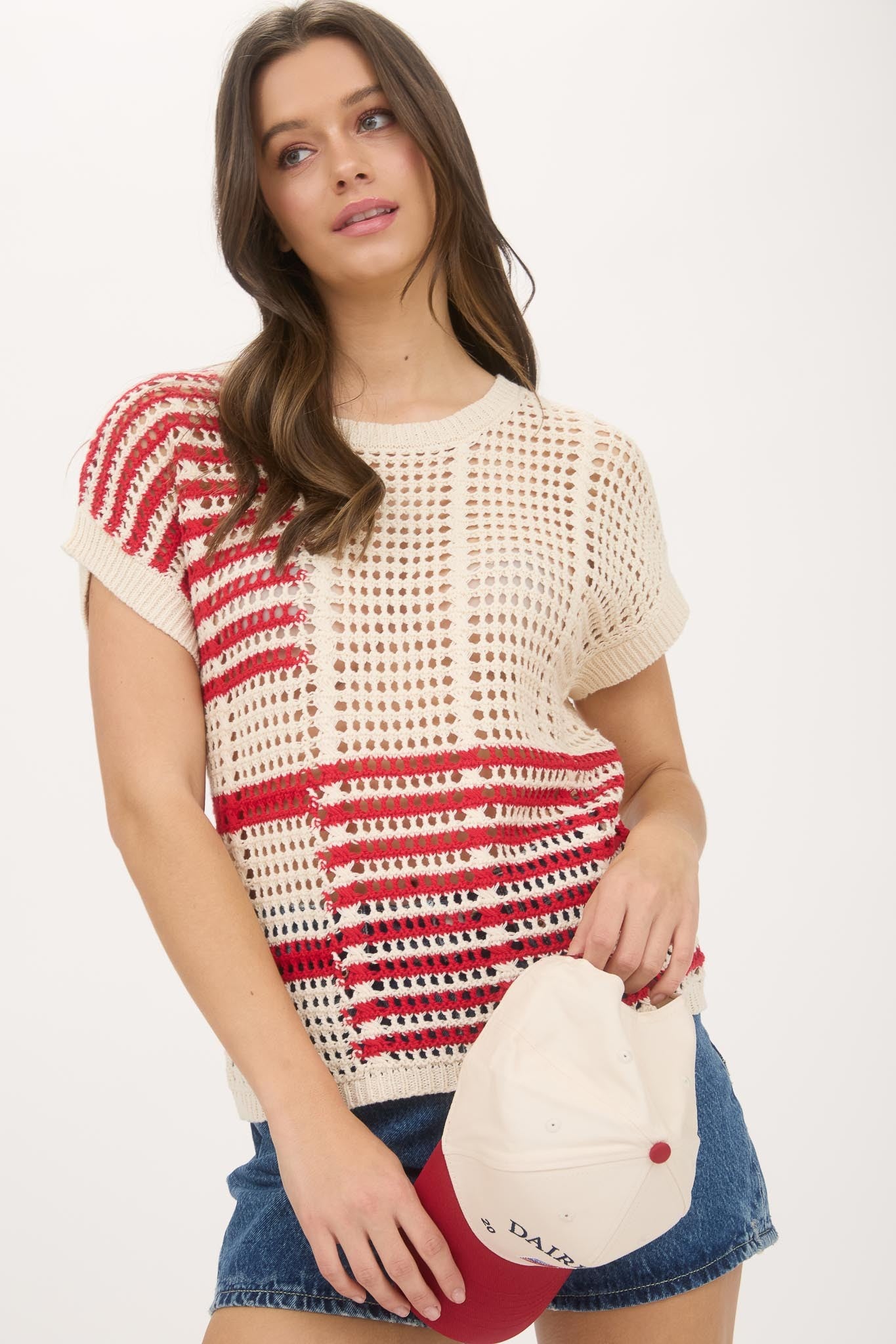Marisol Multi Stripe Short Sleeve Sheer Crochet Knit Top
